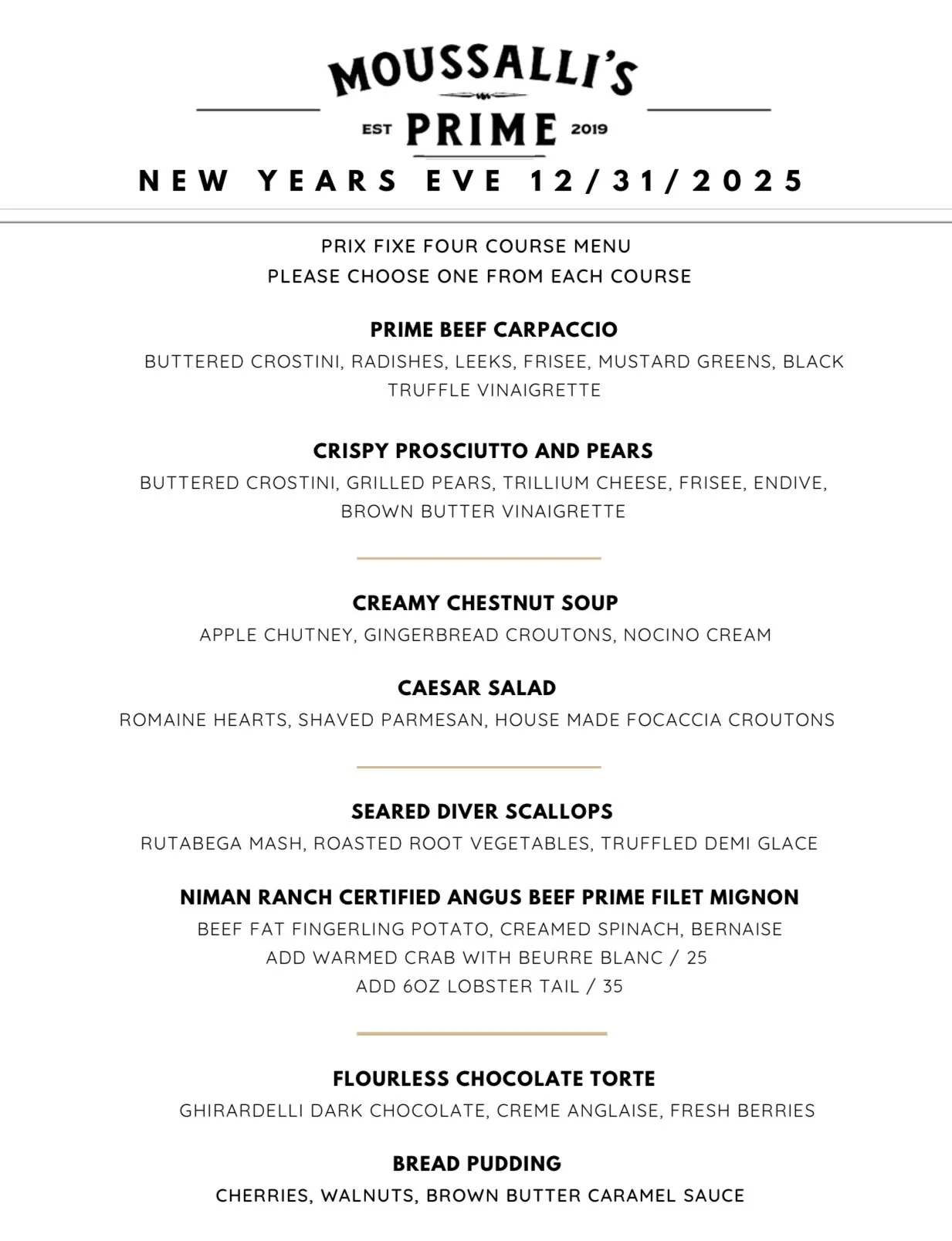 On Wednesday, December 31st we will not be offering our regular menu items. We will be utilizing our Prix Fixe 4 course New Year’s Eve Menu along with some optional additional appetizers. The Prix Fixe Menu cost will be $100 per guest plus tax and tip. Please call the restaurant for available seating times 618-656-0281